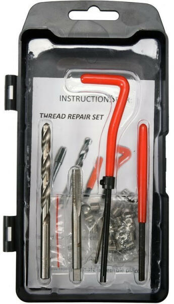 Yato Menetjavító készlet. M8-as, 1,5mm emelkedésű menetek javítására szolgál. Amennyiben a menet már elhasználódott, kitágult, kotyogóssá vált, netán már teljesen használhatatlan, akkor egy ilyen készlettel pillanatok alatt rendbehozhatjuk. Első lépés ként a készletben található fúrószárral újrafúrjuk a furatot. Ne ijedjünk meg, az új furat nagyobb lesz mint az ad