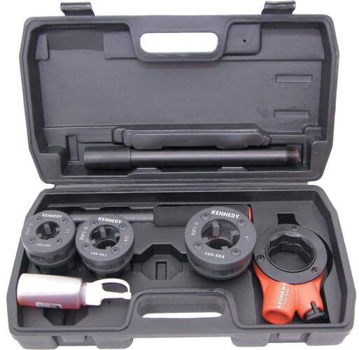 Erős, ipari kivitelű racsnis menetmetsző készlet 1/2", 3/4" és 1"-os gyorsváltó fejekkel Kiváló minőségű anyagokból, 2 darabból álló hajtószár a nagyobb erőhatás érdekében Erős, műanyag tárolódobozban.