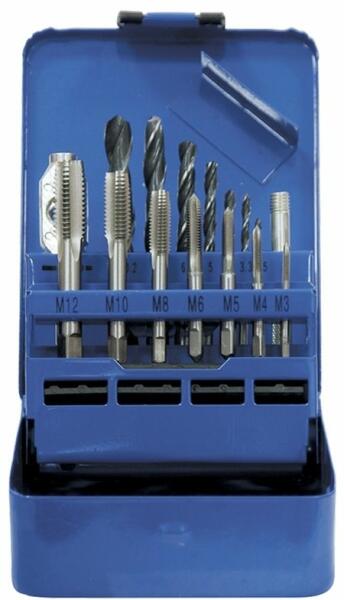 alkalmazás menetjavító készlet csomagolás fém kazetta kiszerelés csapok: M3x0,5, M4x0,7, M5x0,8, M6x1, M8x1,25, M10x1,5, M12x1,75;Menetes fúrószárak: 2,5, 3,3, 4,2, 5,0, 6,8, 8,5, 10,2mm; menetirány jobb alapanyag 9XC acél alalmas színesfémek és acélok megmunkálására, amelyek szakítószilárdsága 800 N/mm2 EAN 4044996083070