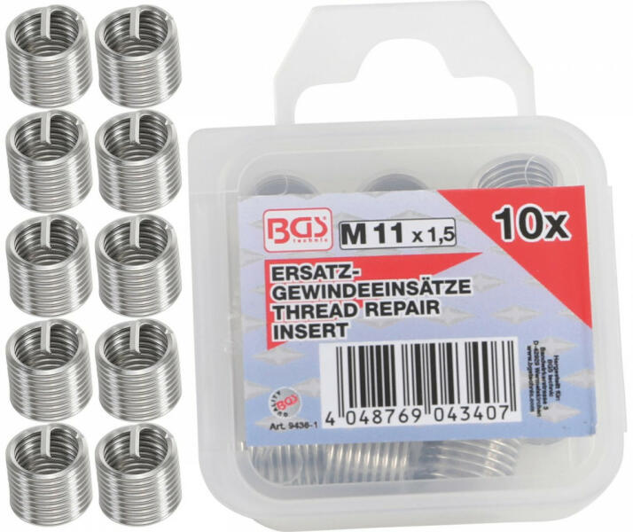 BGS technic 10 részes menetjavító persely készlet, M11X1.5 (BGS 9436-1) 11 mm-es hossz. Élettartam anyag- és törésgarancia!