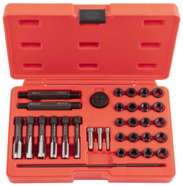 LEÍRÁS Készlet tartalma: Fúrószár Kiütő Menetfúró Behajtószár 20db menetjavító betét Feladata: A tönkrement menetet felújítsa. Használatával erős, strapabíró kötés hozható létre. Alkalmazható magasabb és alacsonyabb szilárdságú anyagokban egyaránt. Széles körben felhasználható. Ideális a motorokban lévő menetsérülések kijavítására. Erős kötést hoz l