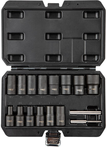 NEO dugókulcs készlet, sérültfejű csavarokhoz. 1/2" dugókulcsok törött, sérültfejű anyákhoz és csavarokhoz. 16 darabos készlet. A belső spirál automatikusan megragadja a sérült csavart/anyát, és lehetővé teszi a biztonságos kicsavarást. Használható ütvecsavarozókkal is.