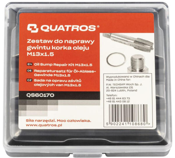 QUATROS TOOLS Szerszámkészlet a sérült M13x1.5mm-es olajcsavar menetének javítására. A készlet tartalma: 1 db – M13 x 1,5mm-es menetfúró. 6 db – csavar. 6 db – alátét.