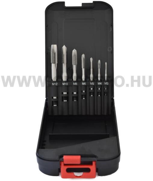 Abraboro HSS-G gépi menetfúró készlet - 7 részes (M3-M12) 7 részes gépi menetfúró készlet, HSS-G acélból. DIN 371 B , 4-5 terelőéllel átmenőfurathoz. Tartalma: 1-1 db M3, M4, M5, M6, M8, M10, M12 Műanyag rendszerező dobozban. Az ABRABORO immár 28 éve forgalmaz professzionális kézi- és elektromos szerszám tartozékokat. Számos, nagyrészt európai gyártó kizárólagos haz
