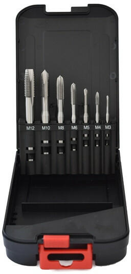 ABRABORO gépi menetfúró készlet M3-M12, 7 részes, HSS-E-Co A készlet tartalma: 7 db gépi menetfúró M DIN 371 / 376 B alak terelőéllel átmenőfurathoz: 1-1 db M3/M4/M5/M6/M8/M10/M12 HSS-E