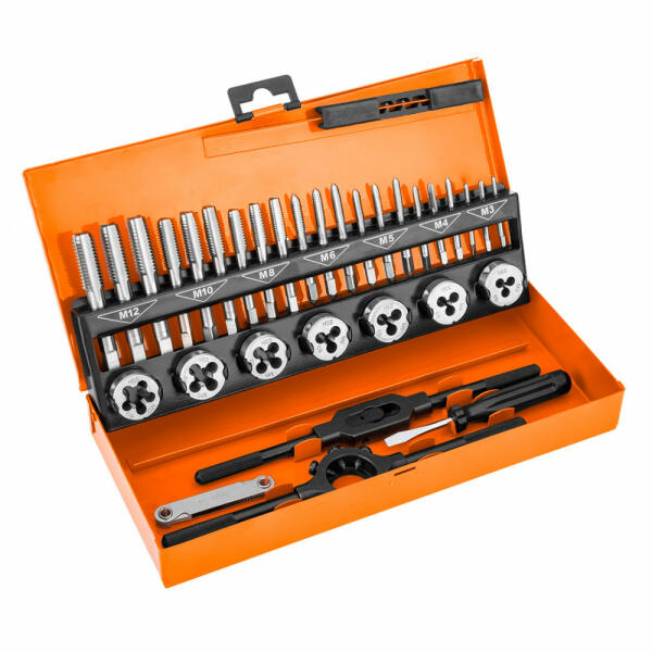 Menetvágó szerszámok és csapok M3-M12, 32 db-os készlet. A Neo 12-915 HSS in a case 12-915 egy menetvágó szerszámkészlet, amely kézi csapokat és szerszámokat, menetmérőt, csavarhúzót a szerszámok rögzítéséhez és egy praktikus fémtáskát tartalmaz az elemek tárolásához. A szerszámok (szerszámok és menetes szerszámok) HSS-ből, míg a mérő és a csavarhúzó 45# acé