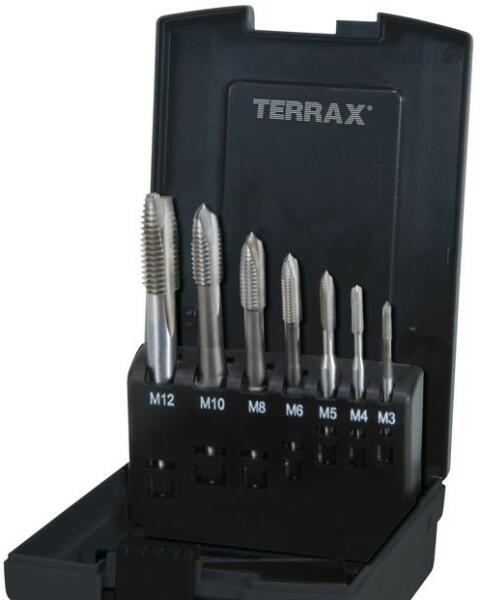 7 részes gépi menetfúró készlet műanyag dobozban alapanyag: HSS DIN 371/ 376 szabvány megerősített szár bekezdés: B alak menet: Metrikus DIN ISO 13 egyenes hornyú jobbos átmenő furat menethez Menet oldalak: hátraköszörülve max. 800 N/mm2 szilárdságú acélokhoz Tartalma: M3, M4, M5, M6, M8, M10, M12