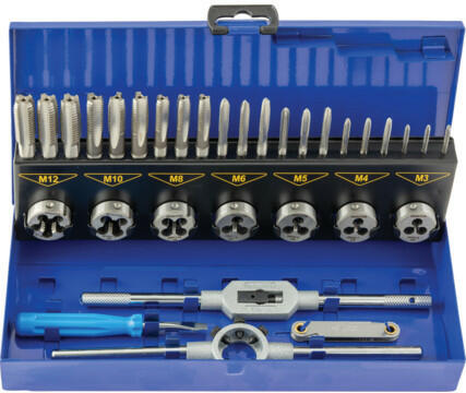 32 darabos készlet, géppel köszörült szénacél menetfúrókkal és menetmetszőkkel, fémdobozos kiszerelésben. Kizárólag általános műhely- és karbantartási használatra. Tartalom: Külső átm. hasított menetmetszők: M3, M4, M5, M6, M8, M10 és M12 Köszörült menetfúrók (anyamenetfúró, utánvágó és készrevágó, mindegyikből 1 db): M3, M4, M5, M6, M8, M10 és M12 Rúdt