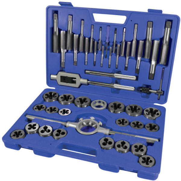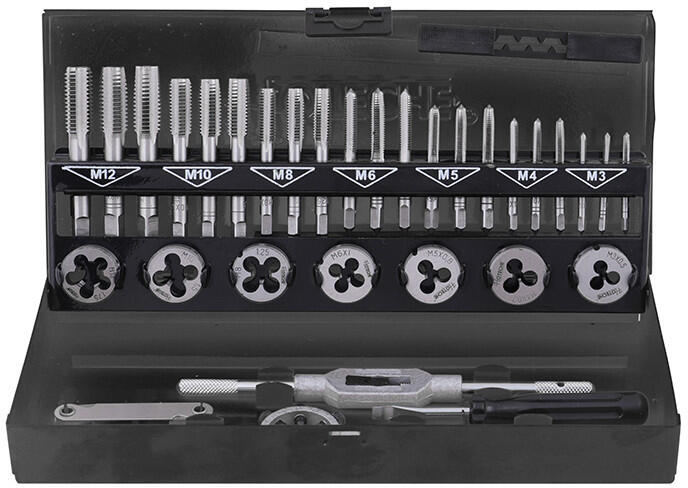 Tartalmazza: 7x menetmetsző: Μ3 × 0,5, Μ4 × 0,7, Μ5 × 0,8, Μ6 × 1,0, Μ8 × 1,25, Μ10 × 1,5, Μ12 × 1,75 21 x menetfúró: 3 x 0,5, 4 x 0,7, 5 x 0,8, 6 x 1,0, 7 x 1,0, 8 x 1,25, 10 x 1,5, 12 x 1,75 (7 x kúpos, 7 x dugó, 7 x aljzat) 1x hajtókar 1x Csavarkulcs 1x menetemelkedés mérő 1x csavarhúzó