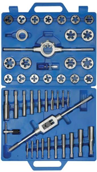 SW STAHL 82250L Menetvágó fúró készlet 45db -termék minõség:ipari/professzionális -Műanyag kazettában -Tartalma: menetvágók és menetfúrók az alábbi méretekben -Finommenetes: 6x0,75 8x1,0 10x1,25 12x1,5 14x1,5 16x1,5 18x1,5 20x1,5 22x1,5 24x1,5 - Szabályos menetes: 6x1,0 8x1,2 10x1,5 12x1,75 14x2,0 16x2,0 18x2,5 20x2,5 22x2,5 24x3,0 - Tartalma továbbá: lapos fejű csavarhúzó
