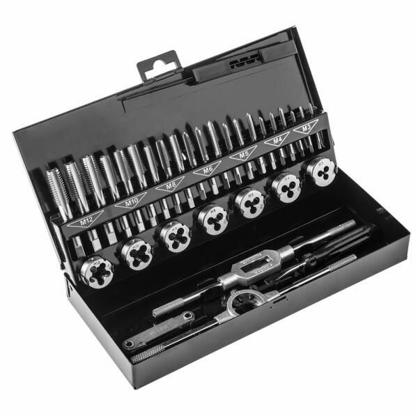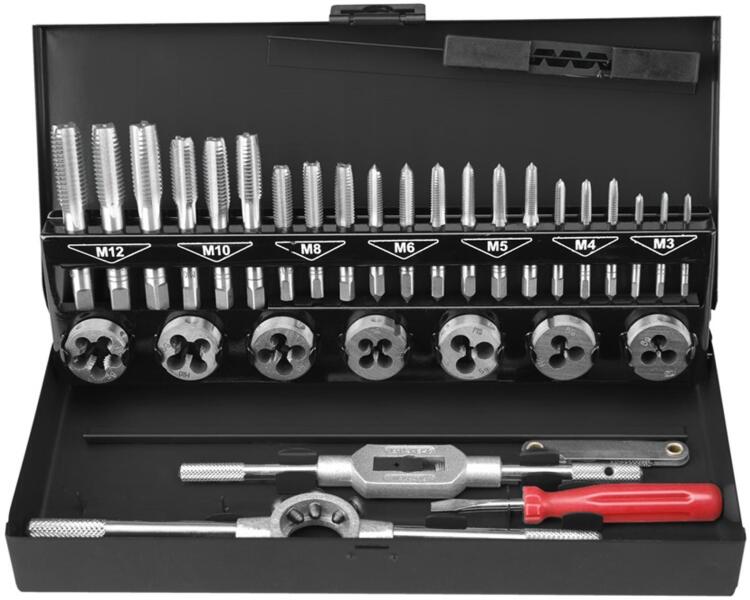 EXTOL premium menetfúró menetmetsző készlet, fém dobozban; 32db M3-M12, jó minőségű szénacél