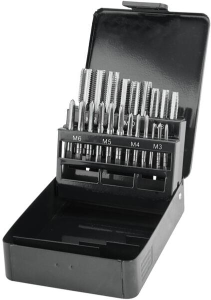 EXTOL premium menetfúró klt. , kézi, fém dobozban; 21db, M3,4, 5,6, 8,10, 12, jó minőségű szénacél, hajtóvas nélkül