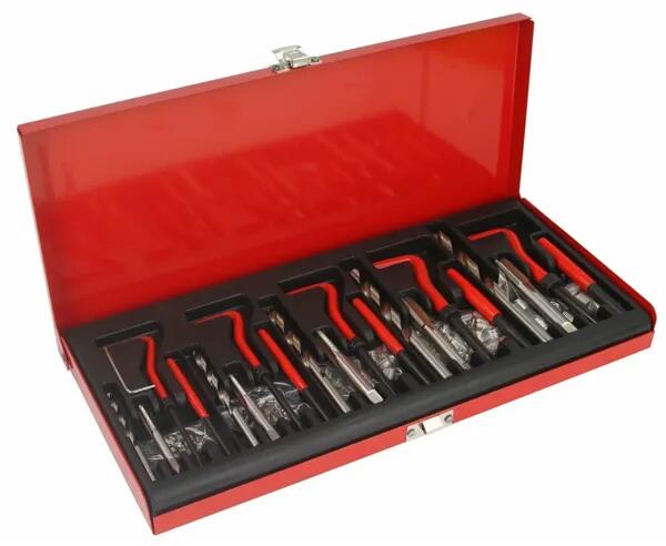 Készlet a leggyakoribb szálak javításához és helyreállításához. Minden fúró és menetfúró kiváló minoségu anyagokból készül. Az egyfokozatú menetfúrók tökéletesen elvágják a menetet, és kemény, rozsdamentes acélból készült spirálbetét kerül beléjük. Mindezt gyakorlati esetben. A készlet tartalma: 5 fúró a sérült menetek dörzsárakhoz 5 db egyfokozatú me