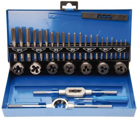 beleértve a következő menetfúró és menetvágó méreteket: M3x0,5-M4x0,7-M5x0,8-M6x1,0-M8x1,25-M10x 1,5-M12x1,75 3 menetfúró méretenként (elő-közép-befejező) tartó a menetfúrók és menetvágók számára