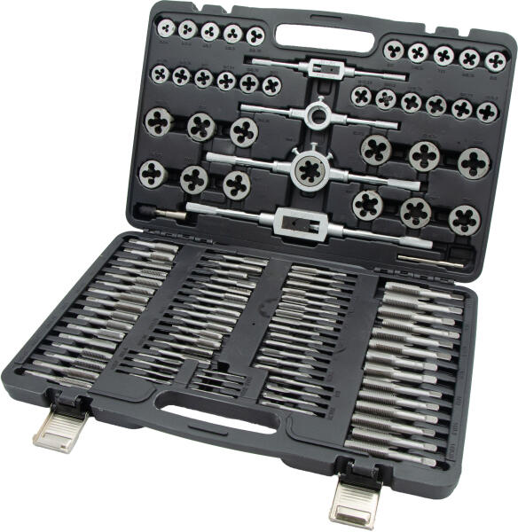 Leírás Kiváló minőségű edzett szénacélból készült. Mindegyik szerszám rendelkezik egy rögzítő furattal, amely a csavar igazításában és rögzítésében segít, ami stabilitást biztosít működés közben. A nagy pontosságú menetvágók rendkívül élesek. A menetvágási és megmunkálási feladatokat hatékonyan látják el. 110db-os menetvágó készlet M2-M18-as menetek