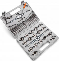 45 darabos metrikus, géppel köszörült menetmetsző- és menetfúrókészlet, durva és finom menetfúrókkal és menetmetszőkkel. Kizárólag általános műhelyi és karbantartási használatra. Erős műanyag tartódobozban. Tartalom: menetfúró-hajtóvas, „T" típusú menetfúró-hajtóvas, menetmetsző-hajtóvas, menetmetsző-adapter, lapos csavarhúzó. Menetfúró- és menetmetsző-m