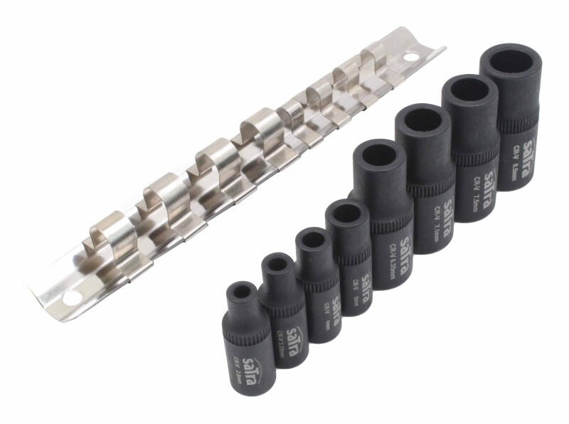 SATRA TOOLS Menetfúró befogó dugókulcs készlet 8 részes, mágneses fém sínnel. Tartalma: 1/4 x 32mm foglalatok: #1(2.8mm), #2(3.35mm), #3(4.0mm), #4(5.0mm) 3/8" x 40mm foglalatok: #5 (6,35mm), #6 (7,1mm), #7 (7,5mm), #8 (8,5mm) Anyaga: CR-V, fekete foszfát bevonat.