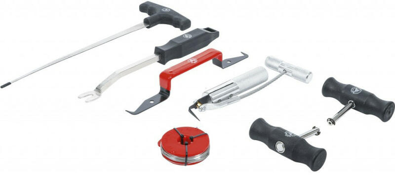 7 darabos speciális szélvédőkivágó készlet, minden olyan szerszámmal, mely a szélvédő kiszereléshez, üvegragasztó eltávolításához szükséges. Speciális profilok. Egykezes - több kezes használat. Dróthoz befogható műanyag húzó markolat. Alumínium és acél anyagból. Bruttó súly: 1160 g Tartalom: 1 db szélvédő kivágó alumínium házzal, egykezes lehúzó 1 db 2-ol