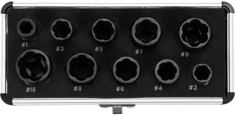 Eszköztípus: Csavar eltávolító készlet Készlet tartalma: 10 darab Méretek: 9 mm, 10 mm, 11 mm, 12 mm, 13 mm, 14 mm, 15 mm, 16 mm, 17 mm, 19 mm Anyaga: 40Cr acél Felületkezelés: Okszidált Felhasználás: Sérült, megszorult vagy lekopott csavarok és anyák eltávolítása Jobbra menetes csavarok és anyák eltávolítása Jellemzők: Speciális kialakítás, amely lehetővé teszi a s