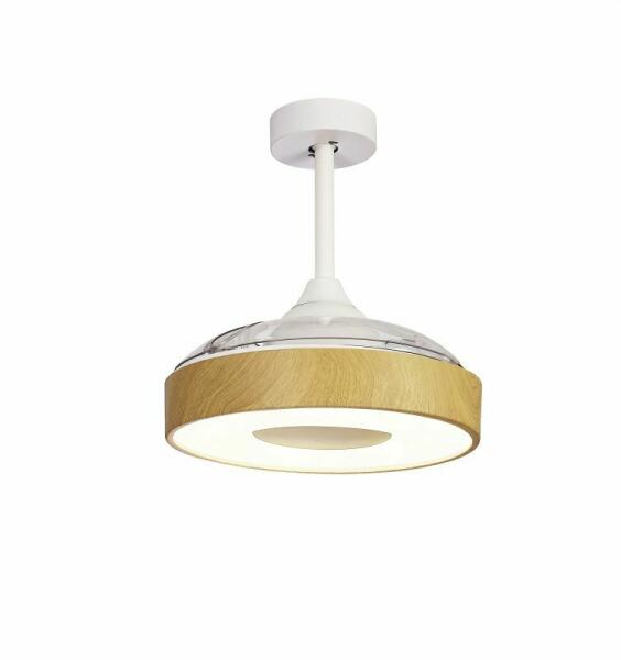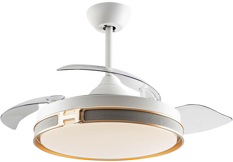 Stílusos, 106cm átmérőjű, matt fehér színű fém vázas ventilátoros mennyezeti lámpa arany szegélyes, szürke műbör dekor gyűrűvel, opálos műanyag búrával, ki és behajtható átlátszó lapátokkal, beépített LED fényforrással. A lámpához távirányító tartozék, mely segítségével állítható a lámpa fényereje, színhőmérséklete (3000-6000K), a lapátok forgás