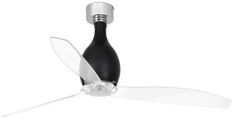 Mennyezeti ventilátor Led lámpafejjel. A fém váz fekete színű. A búra opál műanyag. A ventilátor átlátszó lapátokkal működik, amik induláskor kinyílnak, leálláskor visszahúzódnak. A forgási sebesség állítható, 6 sebességes. Időzíthető. A fényerő és a színhőmérséklet is állítható. A lámpa szerekezte remegésmenteskialakítású. A ventilátorhoz gyárilag t