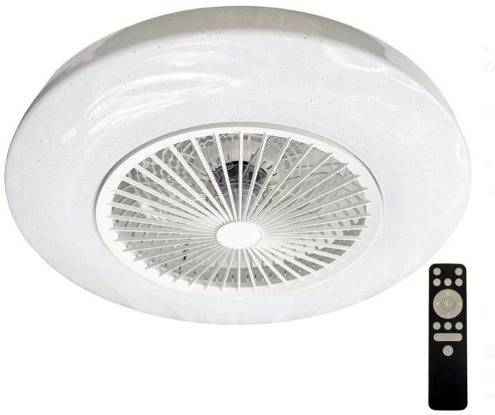 Modern LED mennyezeti lámpa nagy teljesítményű ventilátorral. Alkalmas alacsony helyiségekbe is, ahol kevés a hely. Távirányítót tartalmaz. Egy távirányítóval több lámpa is vezérelhető. A távirányítóval folyamatosan választhatja a fényerősséget. A színhőmérséklet is változtatható: 3000K-tól 6500K-ig. Memória funkció, időzítő és éjszakai fény mód. A ventil