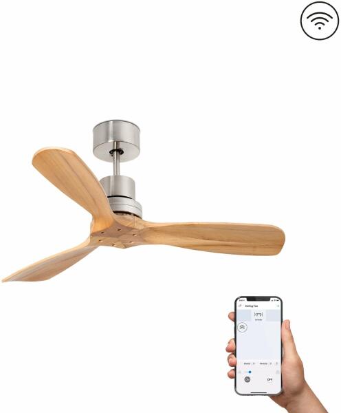 Modern NASSAU mennyezeti ventilátor. Rendkívül egyenletes és csendes működés. Az egyenáramú motor 6 állítható sebességgel rendelkezik, 4-6-10-10-16-16-24-37W és 50-87-125-162-199 -237 fordulatszámmal a sebességtől függően. Vezérelje a ventilátort a WiZ alkalmazáson keresztül (iOS és Android rendszerrel is kompatibilis) Wi-Fisegítségével. Az Alexa, Google Assistant és Si