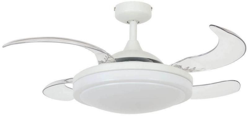 Mennyezeti ventilátor fehér króm színben. Átlátszó aerodinamikai lapátokkal van felszerelve, amelyek a ventilátor bekapcsolásakor automatikusan kinyúlnak és visszahúzódnak. A lapátok képesek elrejtőzni a ventilátor testében, ezért a ventilátor csak lámpatestre vált. 25 m2-es szobákhoz alkalmas. Megfelelő megvilágítást két E27 izzó biztosít (nem tartozék). 3 állíth