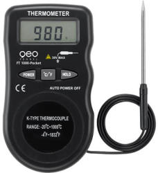 Folyékony és puha anyagok hőmérsékletének mérésére. Főbb jellemzők: Kézi hőmérsékletmérő készülék fém érzékelővel Kicsi, könnyű és könnyen használható Műszaki jellemzők: Hőmérséklet tartomány: -20 °C-tól +1000 °C-ig Pontosság: +- 3% HOLD funkció: igen Automatikus lekapcsolás: igen Az akkumulátor töltöttségi szintje: igen Méretek: 117 x 65 x 24 mm Súl