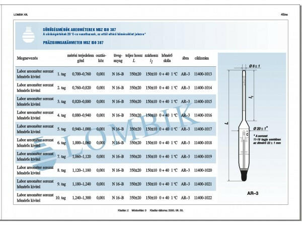 Labor fajsúlymérő 5. tag hőmérővel Mérési tartomány:0,940-1,000 g/ml Osztásköz:0,001 Hőmérő skála:0+40°C/1° Teljes hossz:350+-20 mm