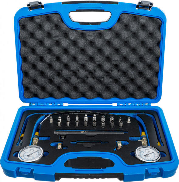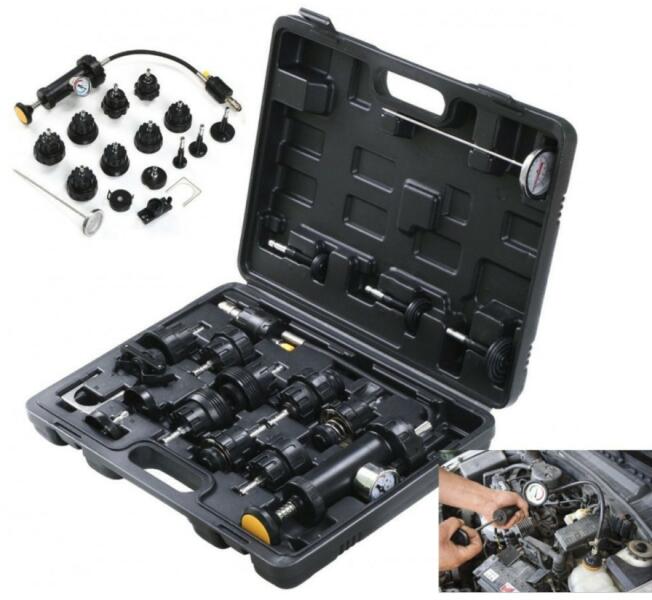 Víztartály szivárgás ellenőrző készlet. Segítségével ellenőrizhető a gépjárművek hűtőrendszerének nyomása, max. 2.5bar-ig (35psi). Gyors össze és szétszerelést biztosítanak az önzáró gyorscsatlakozós alkatrészek. A legtöbb európai és japán járműhöz kompatibilis. Készlet tulajdonságok: