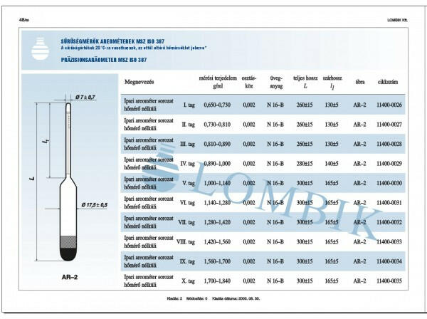 Ipari areométer II. tag hőmérő nélkül Mérési tartomány:0,730-0,810 g/ml Osztásköz:0,002 Teljes hossz:260+-15 mm