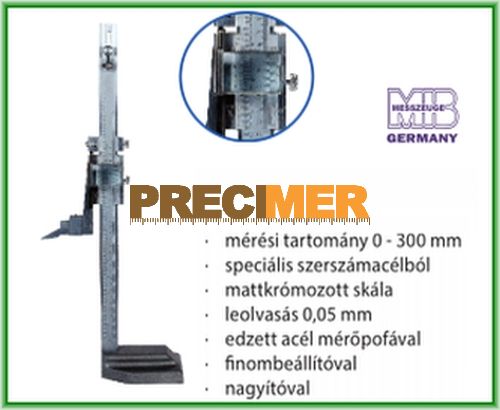 mérési tartomány 300 mm, finombeállítóval mérési tartomány 0–300 mm, speciális acél, skála matt-krómozott, leolvasás 0,05 mm, keményfém karctű, finombeállító