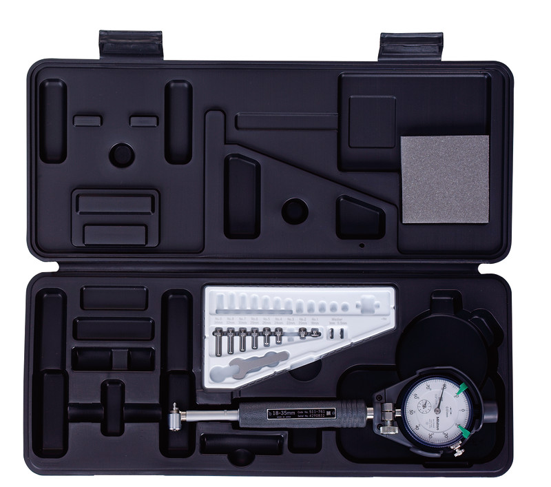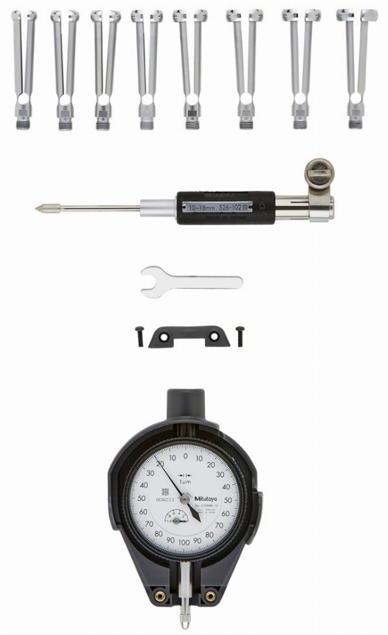 A kétpontos mérőfelület kialakítása révén ideális kis furatok méréséhez. Jellemzői: Precíziós furatmérő eszköz pontos és gyors mérések kivitelezéséhez kis furatok esetén (Átmérő: 0.95-18mm). Igény esetén az analóg mérőóra kicserélhető Digimatic a Tartomány: 10 - 18 mm Síklapúság: 0.001mm Ülékek száma: 8 Tapintó mélység: 62 mm Mérőóra száma: