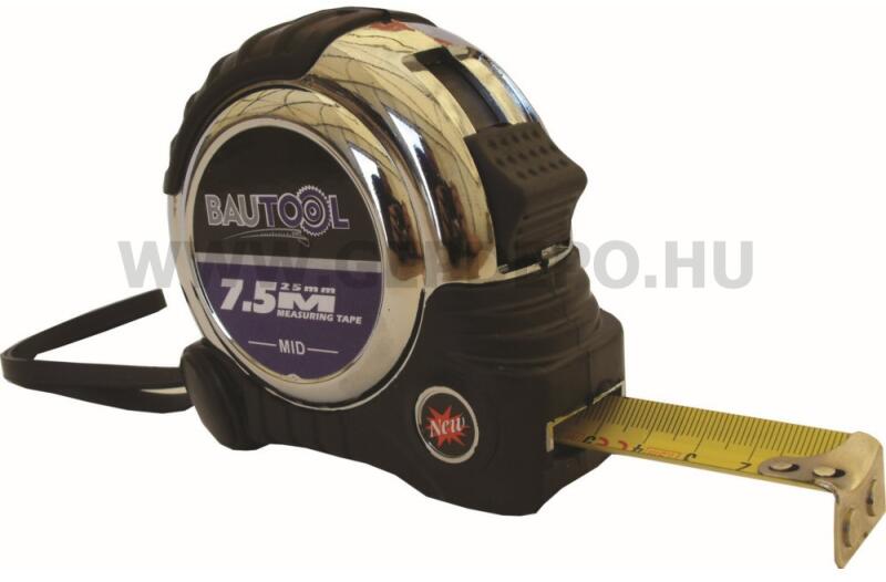 7,5 méteres mérőszalagJellemzők : -A szalag nagy szilárdságú szénacélból készül, és a belső rugó állandó ereje folyamatosan tart. -A mérőszalag egy új ABS házat és vadonatúj fejlesztésű TPR gumírozást kapott, a jó ütésálló teljesítmény érdekében -A szalag felülete fényes kopásálló kezeléssel, fehér alapon fekete egyetlen metrikus nyomtatással készül, c