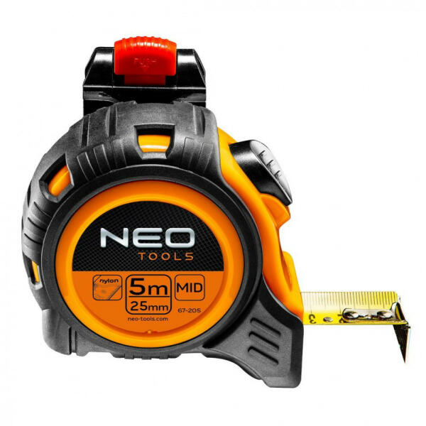 A csomag tartalma:- 1 db Neo mérőszalag acél 5 m x 25mm, autostop, övcsattalA NEO acél mérőszalag automatikus szalagreteszeléssel van felszerelve. A mérőszalag poliamid bevonata védi a rányomtatott skálát a kopástól, megfelelő kialakítása pedig megkönnyíti a mérés elvégzését. A ház szolid felépítése biztosítja az ütésállóságot, ergonómikus formakialakítása é