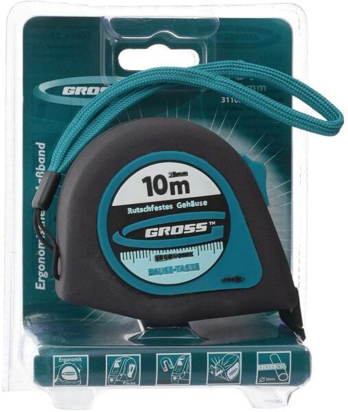 Mérőszalag hosszú távú mérésekhez. Hasznos otthon, a garázsban vagy az építkezésen. A szalag burkolata könnyű, de tartós anyagból készült, amely megvédi a szalagot a sérülésektől. A mérőszalagot üvegszállal erősítették meg a kopásállóság érdekében. A szalag széles, fém fogantyúval van ellát va. Tulajdonságok: Hosszú mérőszalag Mechanikailag robusztus ház