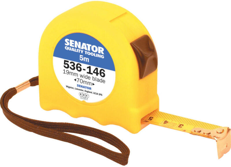 Ütésálló műanyag ház csúszó szalagzárral. Zárórugóval segített szalagvisszafutás. Fém akasztóhorog szegecsrögzítéssel. Acél övakasztó és csuklószíj. A szalagzár a kívánt helyzetben rögzíti a szalagot. Erős, korrózióálló szalag és akasztóhorog. Az önbeálló horog biztosítja a belső és külső mérések pontosságát. Csak metrikus. Méret: 5 m x 19 mm Súly
