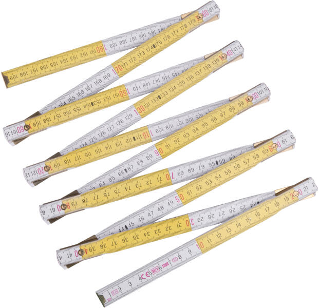 Minőségi bükkfa, tömör sárgaréz kötésekkel és többrétegű, kopásnak, hámlásnak, időjárási hatásoknak és UV-sugárzásnak ellenálló felületkezeléssel, fehér / sárga szín, cm / mm beosztás, pontossági osztály: III.