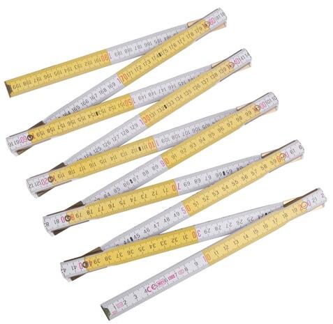 Minőségi bükkfa, tömör sárgaréz kötésekkel és többrétegű, kopásnak, hámlásnak, időjárási hatásoknak és UV-sugárzásnak ellenálló felületkezeléssel, fehér / sárga szín, cm / mm beosztás, pontossági osztály: III.