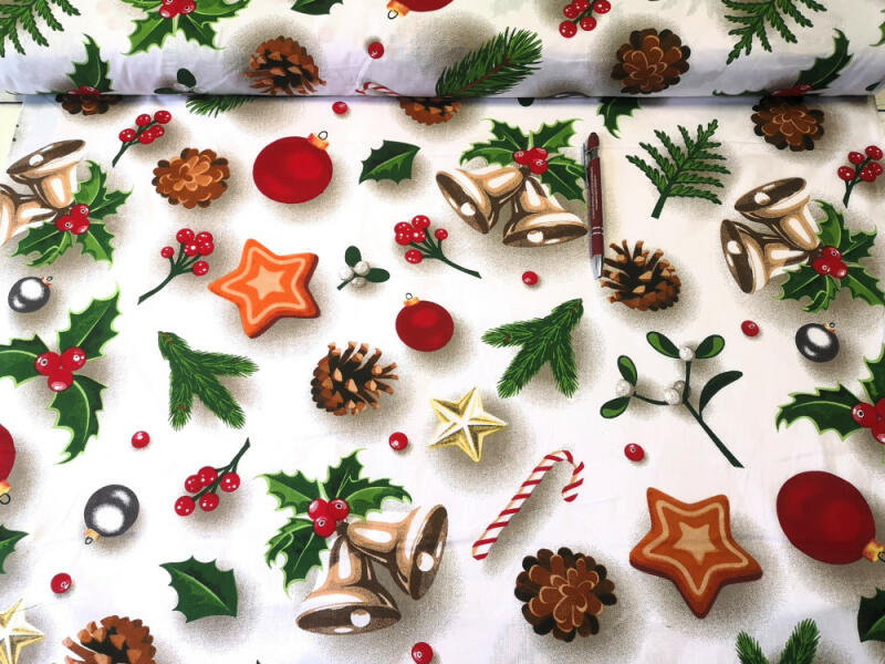 Fehér alapon színes toboz - csengő - fagyöngy mintás karácsonyi pamutvászon méteráru. 100% pamut alapanyagból készült kellemes tapintású, jó nedvszívó képességű anyag. A karácsonyi pamutszövet alkalmas ünnepi díszek, terítők, futók, terítők, díszpárnák, táskák stb. varrására, valamint számos kézműves termék is készül belőle. Anyagszélessége: 160 cm Töm