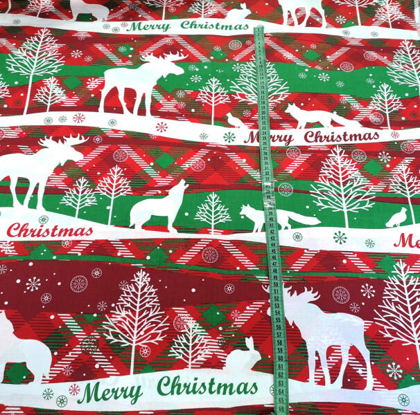 Karácsonyi pamutvászon textília hangulatos piros - fehér - zöld színű sávos karácsonyi motívumokkal, Merry Christmas felirattal. 160 cm széles Alapanyaga: 100% pamut Kellemes tapintású, természetes alapanyagból készült méteráru. Készíthető belőle ágynemű huzat, paplan + párna borítás, terítő, dekor függöny, székpárna, mikulás - zsák, adventi naptár stb Az ára