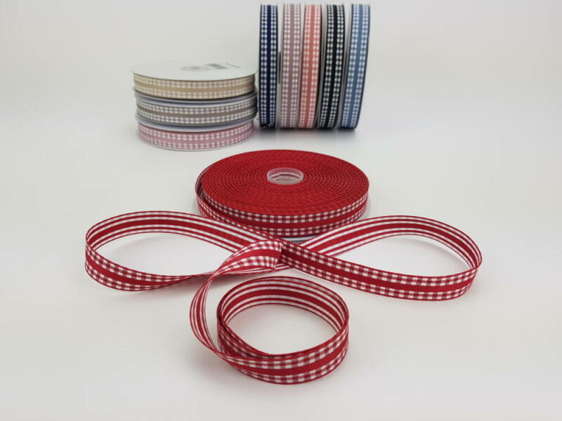 Textil szalag tekercsben. Díszcsomagoláshoz, asztal és ajtódíszekhez, kreatív alkotásokhoz. Kétoldalú! Külső oldala kockás, belső csíkos. Hossz. : 22.5 méter~