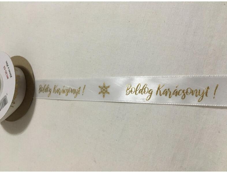 2 cm széles, fehér színű ünnepi szatén szalag, arany Boldog Karácsonyt! felirattal és hópelyhekkel díszítve. A mennyiséget kérjük centiméterben megadni. Pl. : ha 2,6 méter akkor 260 (centiméter).