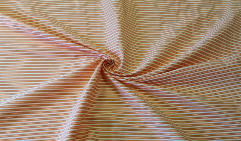 Narancssárga - fehér színű, keskeny csíkozású elasztikus, magas pamut tartalmú ing anyag. Sűrű szövésű, jó szakítószilárdságú, hossz irányban rugalmas textil. Szélessége: 160 cm Összetétele: 48% pamut, 37% viszkóz, 5% spandex. Készülhet belőle: ing, blúz, szoknya, nadrág, egész ruha, dekorációs anyag. Az ár egy méter anyagra vonatkozik. Minimum 1 méter rendelhet