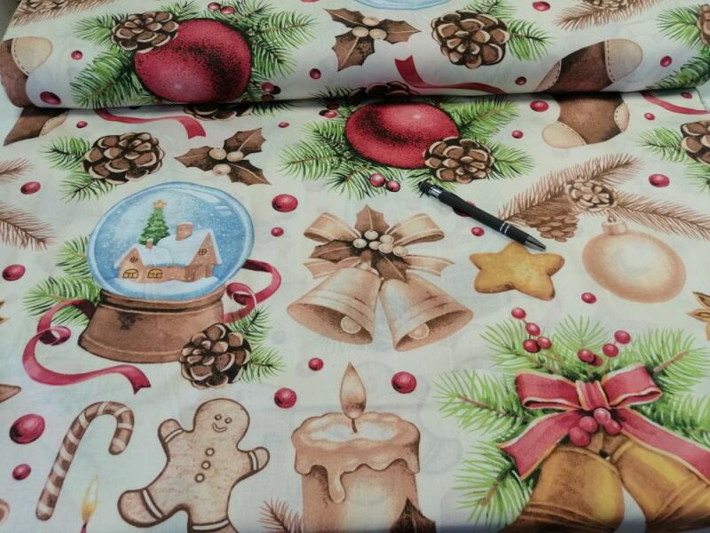 160 cm széles 100% pamutvászon textil, halvány bézs színű alapon különböző színes, nagy karácsonyi mintával. Gyönyörű élénk színeivel igazi karácsonyi hangulatot varázsol! Készíthető belőle ágynemű huzat, paplan + párna borítás, asztalterítő, táska, neszesszer, karácsonyi dekorációk stb. Az ára 1 m-re vonatkozik, minimum 1 m vásárolható, Mosás 40 °C. Kará
