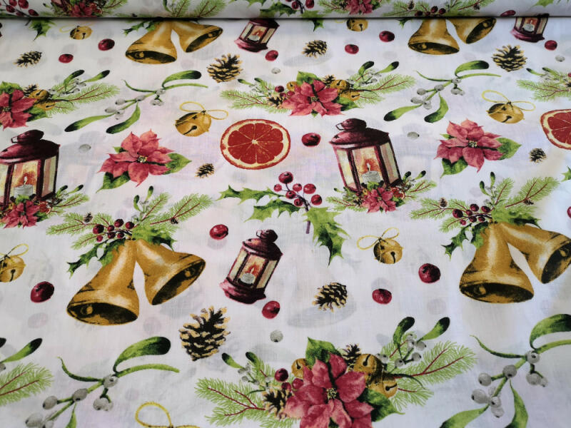 Igazán hangulatos karácsonyi mintás pamutvászon, fehér alapon mikulásvirág - csengő mintával. Pamutvászon - lakástextil vászon, dekorfüggönynek, díszpárnának, asztalterítőnek, karácsonyi dekorációnak, de kiváló alapanyaga a táskáknak, ajándéktasaknak is. 100% pamut alapanyag 160 cm széles Az ára 1 m-re vonatkozik, minimum 1 m vásárolható, felette 10 cm-enként növ