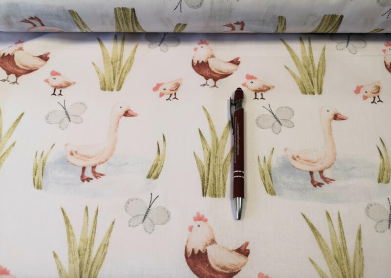 Pamutvászon kiváló minőségű és színtartó mintákkal, fehér alapon pasztell színű tyúkocska - kiscsibe - liba motívumokkal. Finom pamutvászon 100% pamutból, súlya 120 g / m2. Szélessége 160 cm. Mosás: 40 °c Jó nedvszívó és légáteresztő képességű természetes anyag, tapintása kellemes. Készíthető belőle ágynemű huzat, paplan + párna borítás, ovis termékek. .