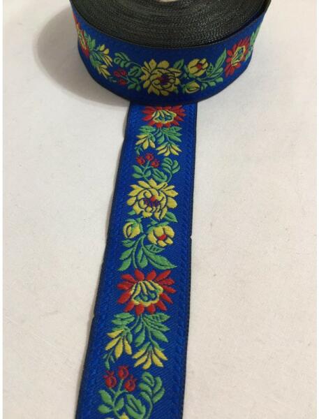 3,3 cm széles, királykék alapon, matyó mintával szövött díszítő szalag. Népviseletes ruhákra, mellényekre, terítőkre, ballagó tarisznyákra, kézimunkák szélére, ruhák díszítésére. A mennyiséget kérjük centiméterben megadni. Pl. : ha 2,6 méter akkor 260 (centiméter).