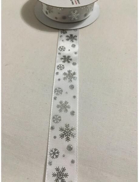 2,3 cm széles, fehér színű ünnepi szalag, ezüst hópelyhekkel díszítve. A mennyiséget kérjük centiméterben megadni. Pl. : ha 2,6 méter akkor 260 (centiméter).